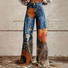 These jeans are a canvas of vibrant artwork, featuring detailed nature-inspired imagery. The design includes a radiant sun with a face, twinkling stars, a strolling orange cat, and sunflowers set against a rich blue denim backdrop.
