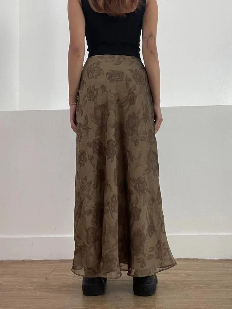 This Women's Grunge Boho Skirt blends vintage allure with contemporary style, featuring a muted brown color palette adorned with subtle floral prints. The skirt's lightweight, semi-sheer fabric drapes elegantly to a maxi length, offering a flowing, ethereal look that's both casual and chic. The high-waist design complements its loose silhouette, making it versatile for pairing with both cropped tops and tucked-in blouses.