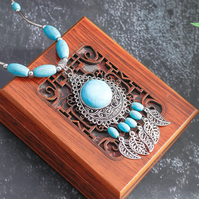 Capture the essence of bohemian charm with this stunning turquoise stone necklace. Featuring an intricately designed water drop pendant, accented with ornate metalwork and delicate filigree leaf charms, this piece embodies vintage elegance and free-spirited beauty. The link chain design incorporates polished turquoise beads for an authentic Southwestern-inspired look, making it a perfect accessory for parties, casual wear, or festival outfits. Whether worn alone or layered, this necklace is a true statement piece for those who appreciate bold yet elegant jewelry.