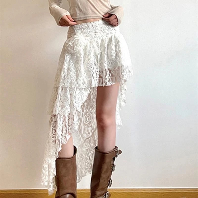 This Women's Short Hippie Skirt offers a stunning combination of bohemian elegance and modern flair. Crafted from exquisite white lace, this skirt features intricate floral patterns that add depth and texture to the design. The high-low hemline creates a playful yet sophisticated silhouette, making it a perfect choice for a variety of occasions.